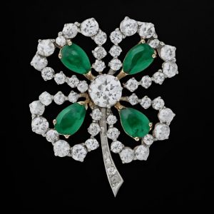 DIAMANTOVÁ BROŽ SE SMARAGDY VE TVARU ČTYŘLÍSTKU