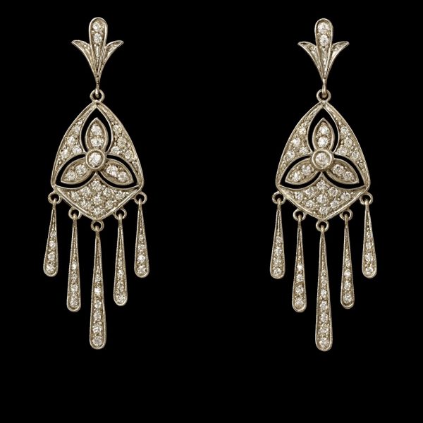 Reprezentativní visací náušnice z 18kt zlata, bohatě osazené 108 přírodními brilianty v briliantovém brusu (celková hmotnost cca 1,60 ct). Centrální medailon se stylizovaným trojlístkem je celoplošně vsazen pavé, spodní část tvoří pět pohyblivých kapkových přívěsků s brilanty pro maximální třpyt při pohybu. Elegantní, společenský šperk ve stylu art deco.