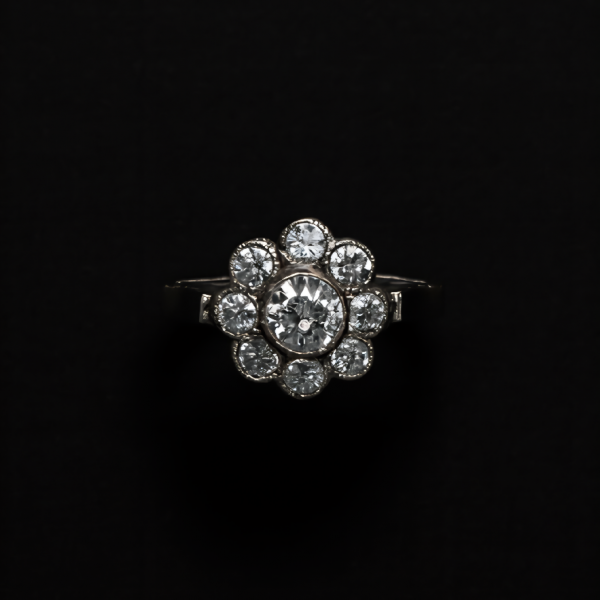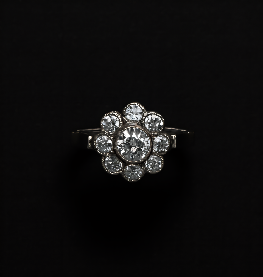 Elegantní prsten s nadčasovým květinovým motivem, osazený devíti brilantně broušenými přírodními diamanty o celkové hmotnosti 0,84 ct.